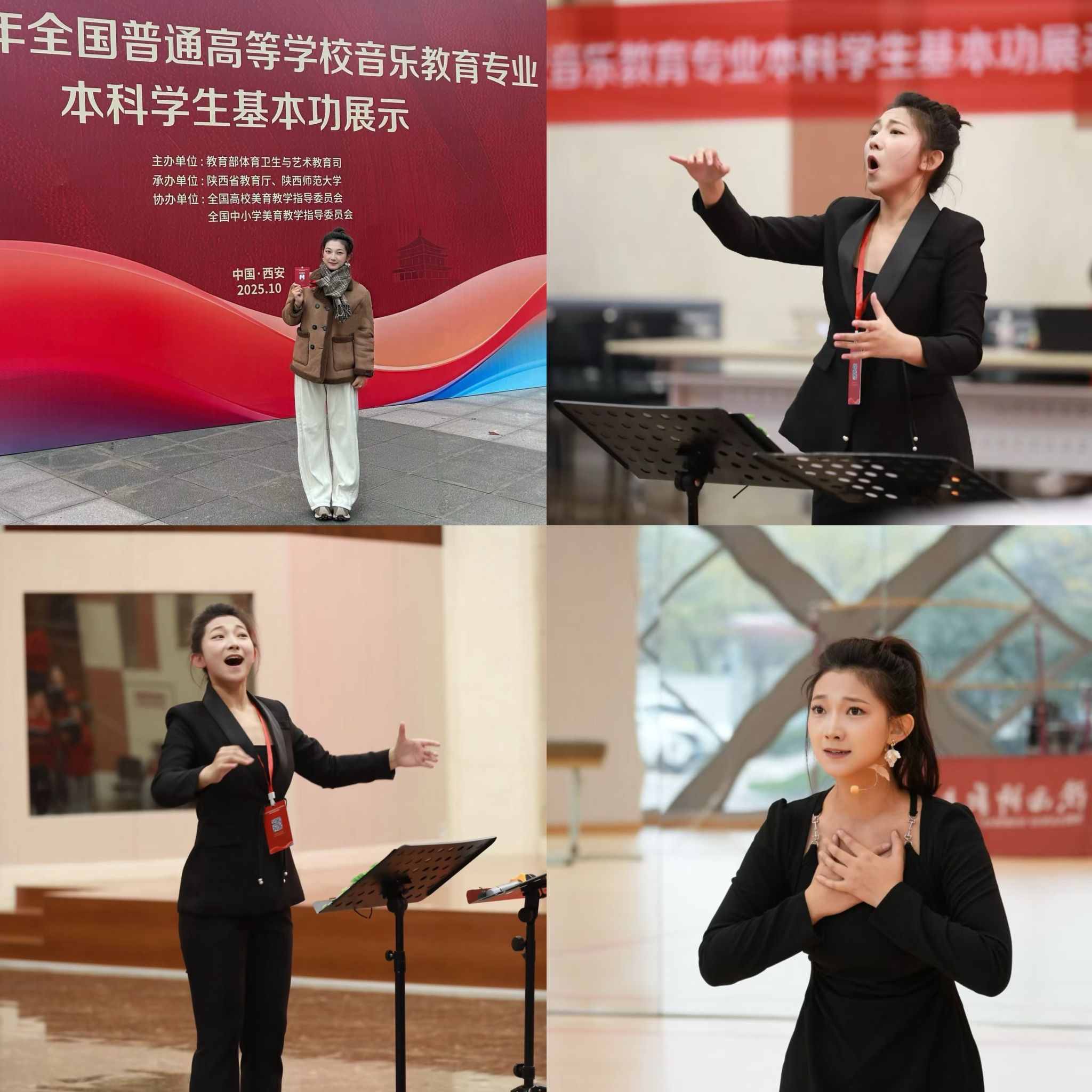 据悉,本次展示活动由教育部体育卫生与艺术教育司主办,陕西省教育厅、陕西师范大学承办。是全国高校音乐教育专业领域极具权威性与影响力的赛事,旨在检验和提升音乐教育专业本科学生的综合素养与教学实践能力,为全国音乐教育人才搭建交流学习的优质平台。活动涵盖了学生教学展示(微课)、即兴弹唱、合唱指挥、自选项目(器乐、舞蹈、戏曲、戏剧),指导教师现场说课、审美和人文素养展示、专业技能展示(声乐演唱、钢琴演奏、中外乐器演奏、指挥、即兴弹唱)、社会实践等,充分体现了音乐教育专业“教”“艺”并重的核心理念。对参赛选手的专业技能、教学能力和艺术素养进行全方位、高标准的考评,竞争异常激烈。